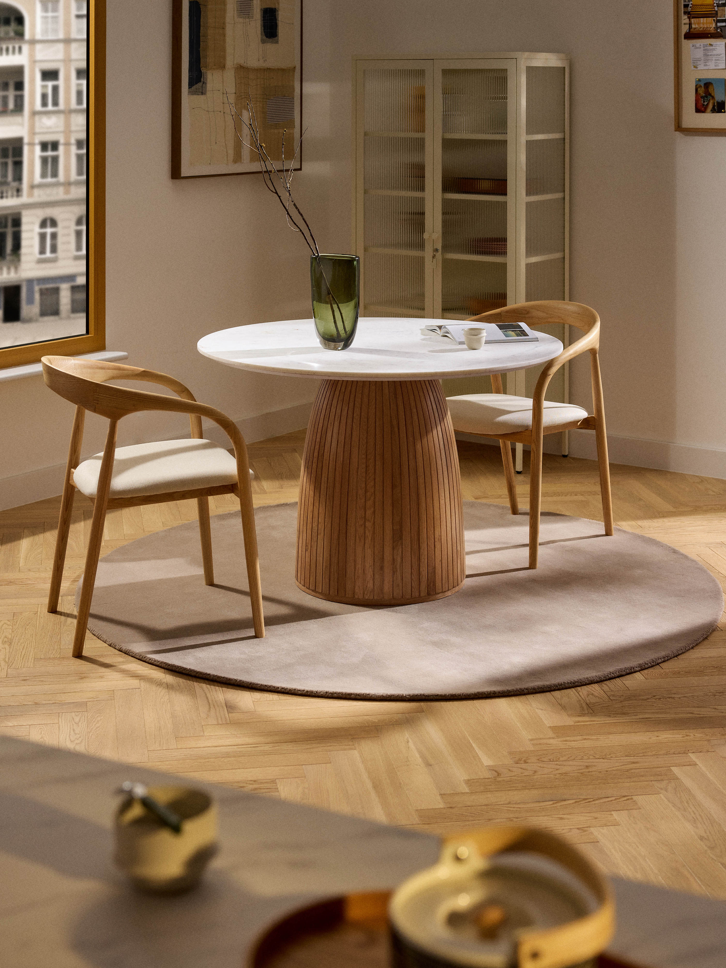 Fold Yuvarlak Beyaz Mermer Tablalı Ahşap Yemek Masası Meşe ön siparişin alındı ürün stoğa girer girmez gönderim sağlanacaktır.