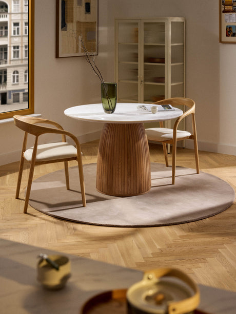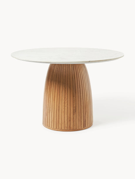 Fold Yuvarlak Beyaz Mermer Tablalı Ahşap Yemek Masası Meşe